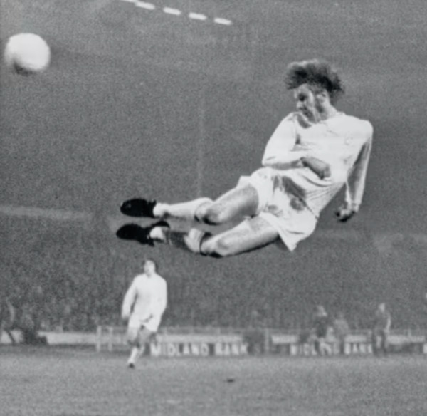 Kim går til vejrs, rammer bolden lidt for meget med toppen af hovedet. Overlægger ud.