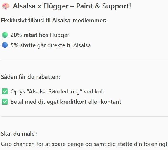 Vi har lavet en aftale med Flügger om, at Alsalsa Medlemmer får 20% rabat hos Flügger. Samtidig får Alsalsa 5%. For at få rabatten skal du ved køb oplyse “Alsalsa Sønderborg”.