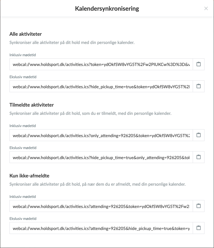 Her skal du beslutte om du vil synkronisere alle aktiviteter, de aktiviteter du er tilmeldt, eller de aktiviteter du ikke er tilmeldt, og samtidig om du ønsker at inkludere eller ekskludere evt. mødetid. Du kopierer blot det link der passer til din beslutning.