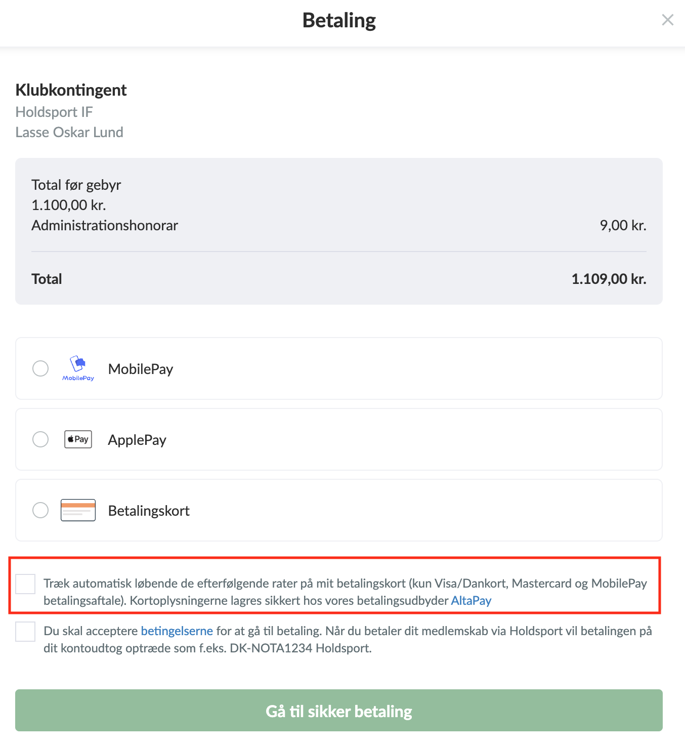 Sæt blot flueben ved Træk automatisk løbende de efterfølgende rater på mit betalingskort