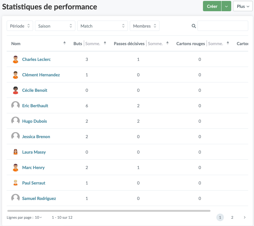 Vous pourrez voir les statistiques de toute l'équipe, par catégorie