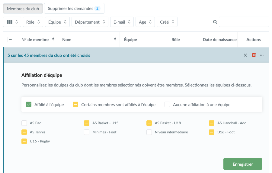 REMARQUE : Il est également possible d'ajouter un membre existant dans une nouvelle équipe depuis le bouton vert Ajouter un membre et ensuite Sélectionner un ou plusieurs membres du club