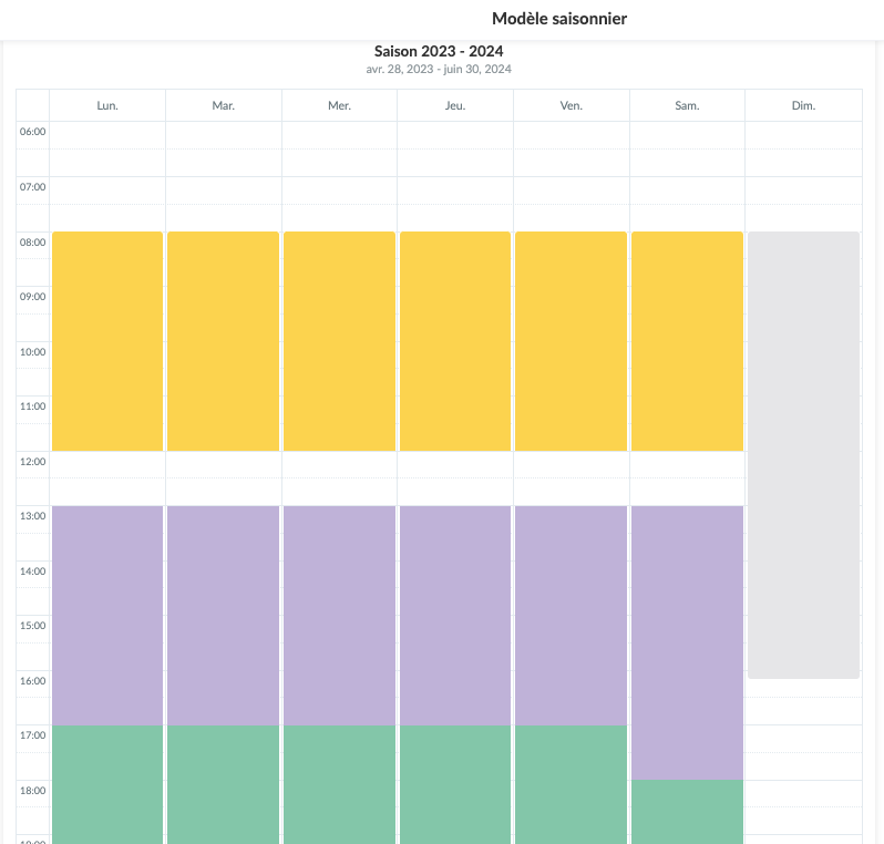 - Si une équipe s'entraîne sur un terrain une fois par semaine, elle ne souhaite pas réserver le terrain pour toute une saison. Elle souhaite plutôt réserver un créneau horaire spécifique pour une saison entière.
