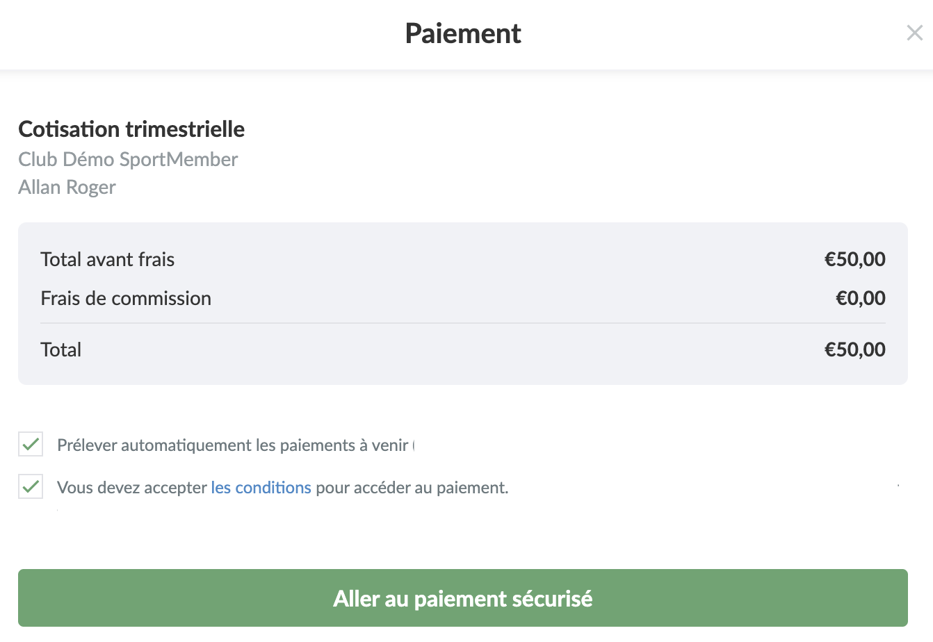 Sur la page de paiement, vous verrez toutes les informations pertinentes : le montant total de la cotisation, les frais de commission (dans certains cas, elle peut être payée par le club ou le membre), les termes et conditions que vous DEVEZ accepter.