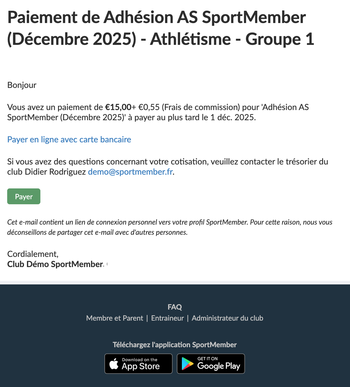 Vous recevrez un e-mail de paiement 14 jours avant la date d'échéance de la cotisation. Si vous avez enregistré un mode de paiement pour être prélevé automatiquement, vous ne recevrez un e-mail de rappel que 48 heures avant votre prélèvement.