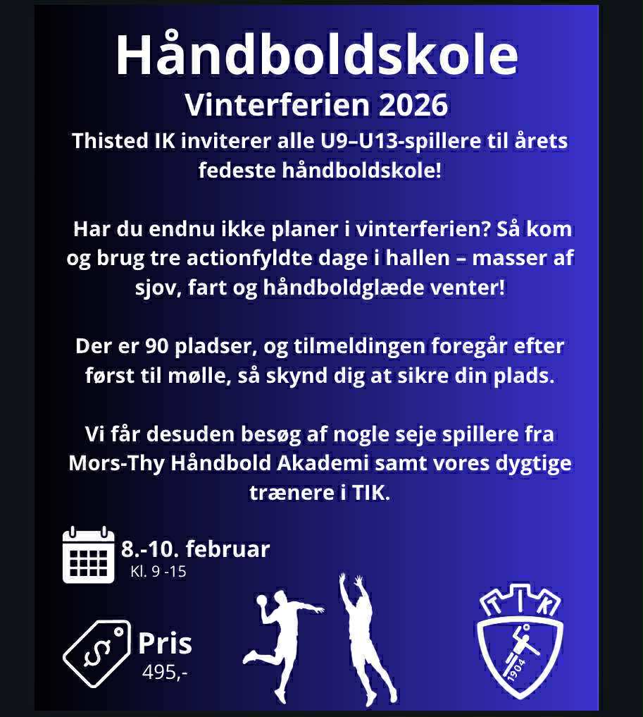 Thisted IK inviterer til håndboldskole i vinterferien 2026 - se den vedhæftede invitation