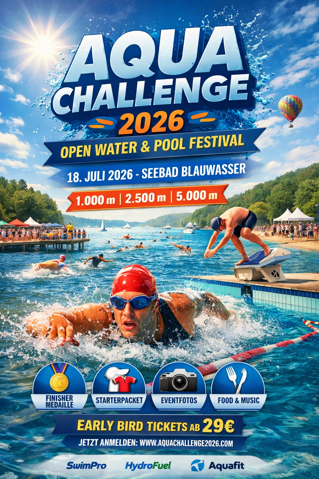 Die Aqua Challenge 2026 ist ein eintägiges Schwimmevent für ambitionierte Freizeitschwimmer, Vereinssportler und Nachwuchstalente. Ob im Open Water oder im 50m-Wettkampfbecken – hier steht sportlicher Wettbewerb, Community und Sommer-Feeling im Mittelpunkt.